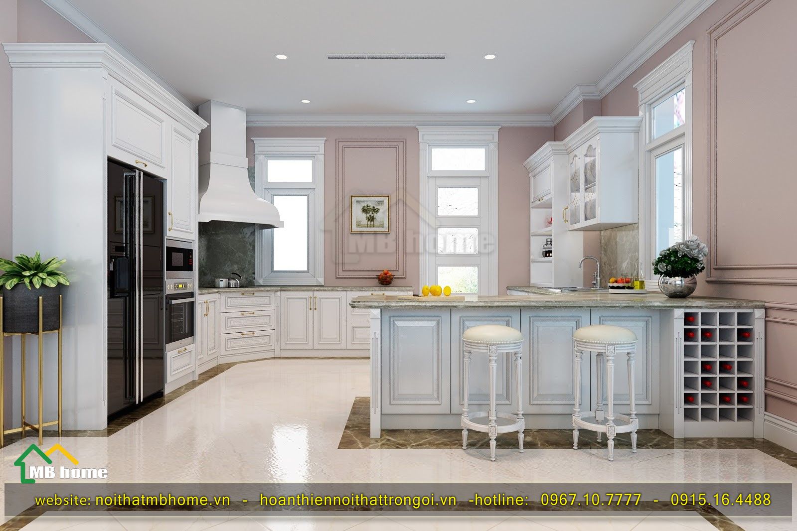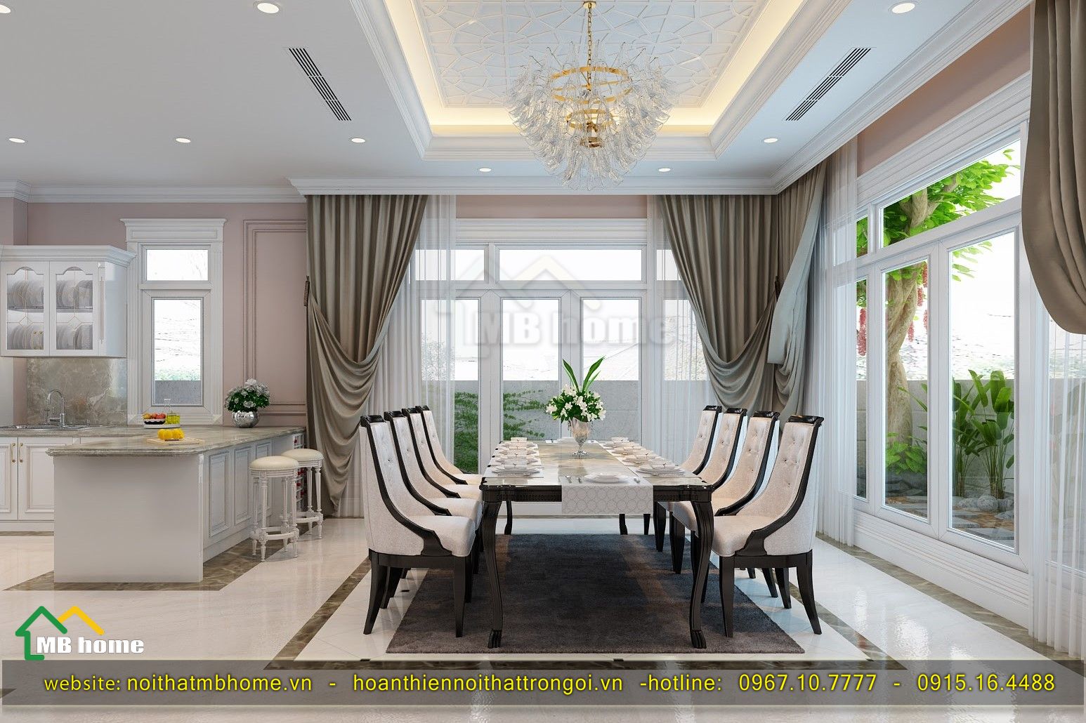 Đối diện với phòng khách là phòng bếp. Ghế bàn ăn có thiết kế phần tựa lưng cao được bọc đệm mang lại sự thoải mái khi ăn uống. Thiết kế ban đầu với số lượng 8 ghế, MB Home có thể điều chỉnh theo nhu cầu của khách hàng là tăng hoặc giảm.