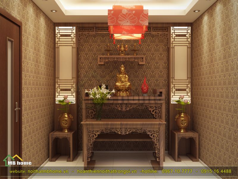 Tầng trên cùng với phòng thờ chính là nơi gia chủ tĩnh tâm và tưởng nhớ tổ tiên. Vì thế MB Home sử dụng tone màu trầm của gỗ làm chủ đạo, sử dụng giấy dán tưởng cao cấp với họa tiết tương đồng với họa tiết kệ thờ.