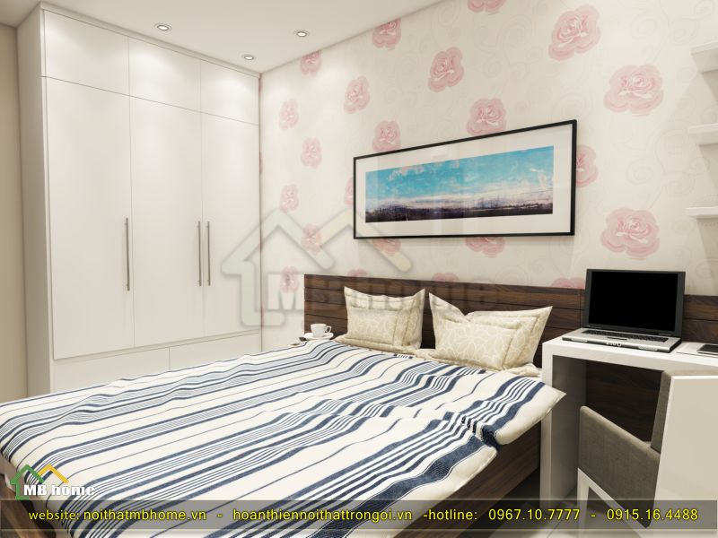 Phòng ngủ thứ hai trong nhà lô phố này dành cho con gái của anh chị. Cô bé 16 tuổi ưa thích màu sáng vì thế nên MB Home quyết định sử dụng giấy gián tường họa tiết hoa hồng, tạo cảm giác tươi vui cho căn phòng. Cùng với đó là chăn ga nền trắng sọc xanh bắt mắt, tạo điểm nhất cho phòng ngủ này.