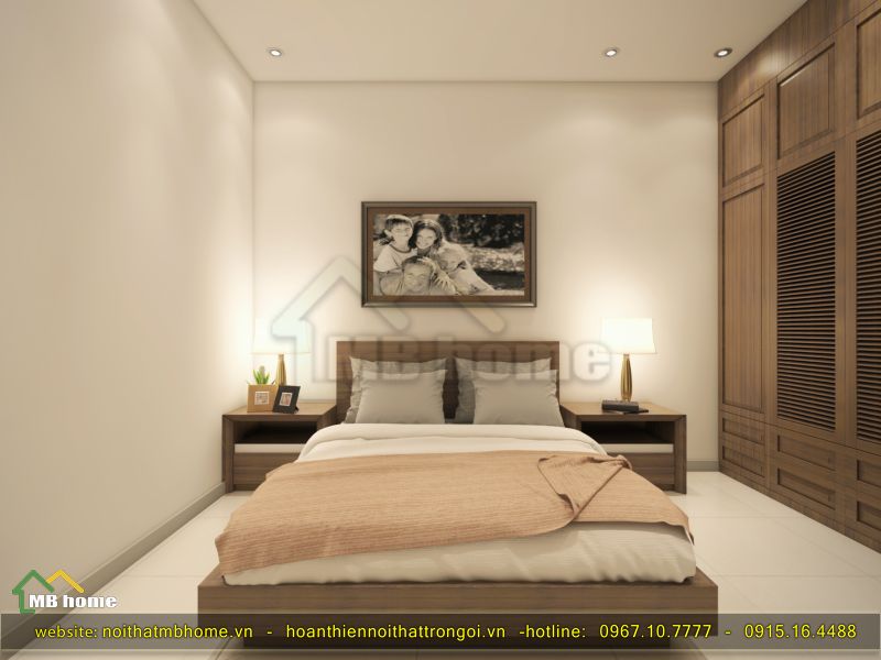Đầu tiên là không gian riêng dành cho vợ chồng anh chị Khương. MB Home đưa vào đây thiết kế nội thất theo hơi hướng hiện đại nhưng tối giản với chất liệu gỗ tự nhiên.