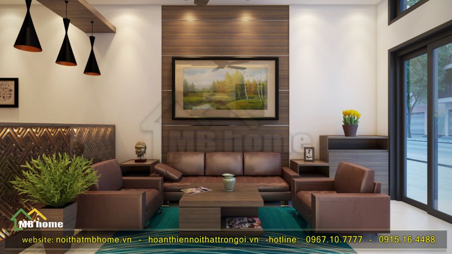 Với sở thích của gia chủ là thích những tone màu trung tính và trầm. Vì thế, MB Home sử dụng toàn bộ nội thất gỗ màu nâu gụ trầm. Tuy nhiên để tạo điểm nhấn trong căn phòng, chúng tôi tận dụng thêm thảm trải sàn màu xanh để làm nội bật, cùng tranh treo tường phía sau màu sáng hơn.
