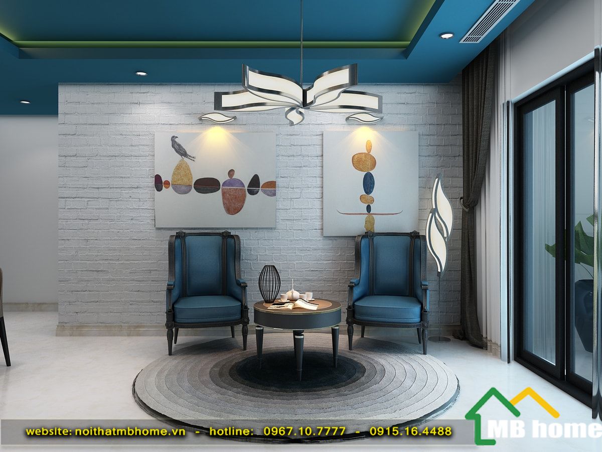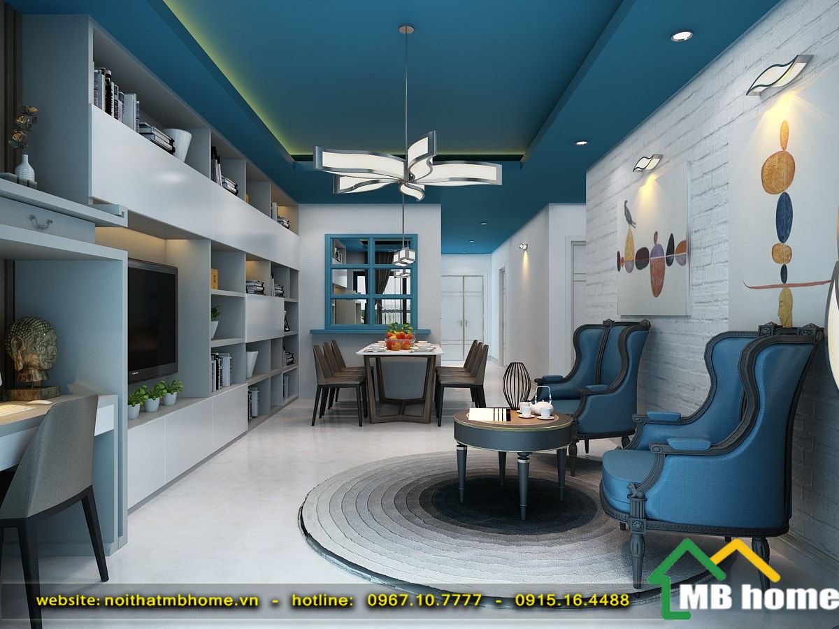 Với ý tưởng từ bầu trời xanh, chúng tôi khoác lên mình căn hộ với màu xanh blue của trần nhà và màu trắng tinh khiết của toàn bộ không gian, tạo lên một cái nhìn khác lạ, nhẹ nhàng nhưng không kém phần hiện đại.