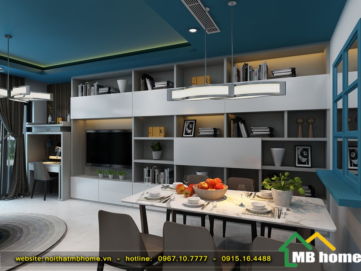 Căn hộ được thiết kế với không gian phòng khách nối thông với khung vực sinh hoạt. Lấy gam màu tươi mát làm chủ đạo, cùng những điểm nhấm cực kỳ sang trọng và bắt mắt.