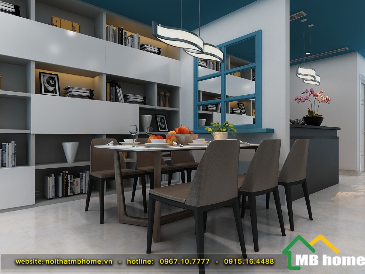 Bàn ăn bằng chất liệu gỗ được thiết kế đẹp mắt. Phía sau cũng là kệ để đồ trang trí. Bếp được ngăn cách với căn phòng bằng 1 bức tường với thiết kế có của sổ tạo cảm giác sạch sẽ hơn cho cả căn phòng.