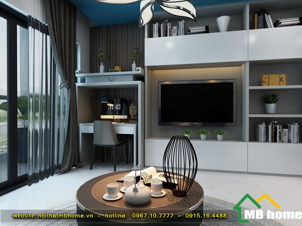 Thiết kế bàn làm việc ngay sát cửa để tạo cảm giác thoải mái hơn. Kệ tivi trang nhã được làm từ gỗ cao cấp, tích hợp thêm kệ giá để đồ vật trang trí tiện lợi vừa tiết kiệm không gian vừa cho gia đình có thêm nơi để lưu trữ đồ đặc
