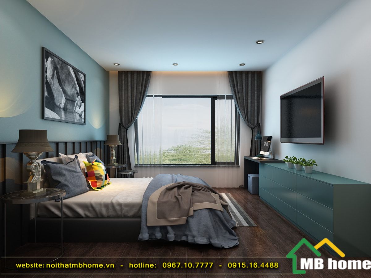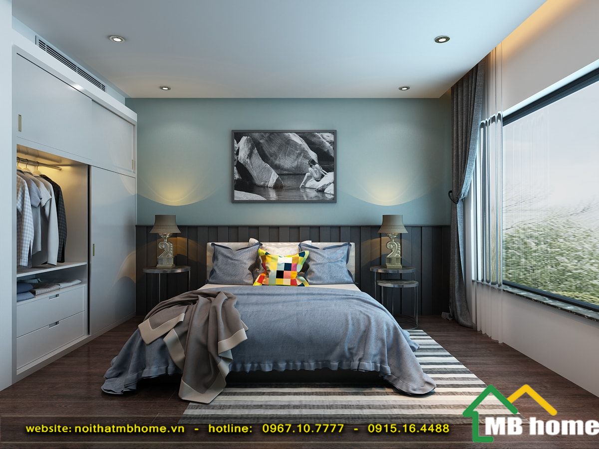 Không gian nội thất phòng ngủ chú trọng tạo sự thoải mái, không cần cầu kỳ nhưng vẫn phải đảm bảo những đồ dùng cần thiết. Vẫn giữ màu sắc man mát, xanh xanh nhưng nhẹ hơn so với phòng khách. Vừa mát mẻ cho mùa hè lại vừa ấm áp cho mùa đông.