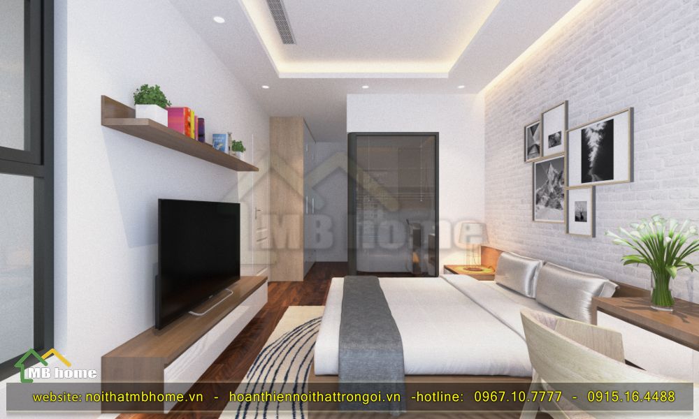 Và tất nhiên việc thiết kế phòng ngủ không thể thiếu các đồ dùng tiện nghi hiện đại được, chính vì thế chiếc tivi được kiến trúc sư thiết kế nội thất sắp xếp đối diện vời chiếc giường mà nằm sát tường. Nền gỗ nâu đậm giúp nổi bật bức tường trắng xóa, tạo nên vẻ đẹp trang trọng, hiện đại vô cùng.