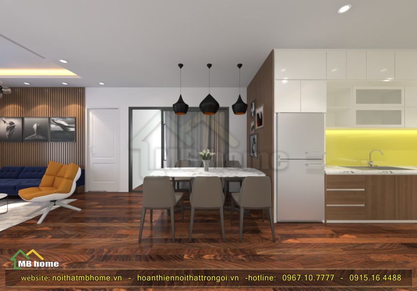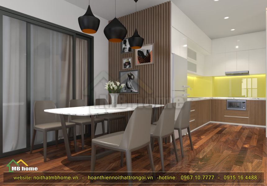 Với tổng diện tích 68m2, căn chung cư hai phòng ngủ này có không gian phòng bếp tương đối nhỏ hẹp, chính vì thế các kiến trúc sư của MB Home đã sắp xếp hợp lý và khoa học vị trí bàn ăn cùng gian bếp nấu nướng. Bàn ăn được xếp nối liền với bộ bàn bếp giúp người nhìn thấy rõ được sự liền mạnh và liên kết với nhau.
