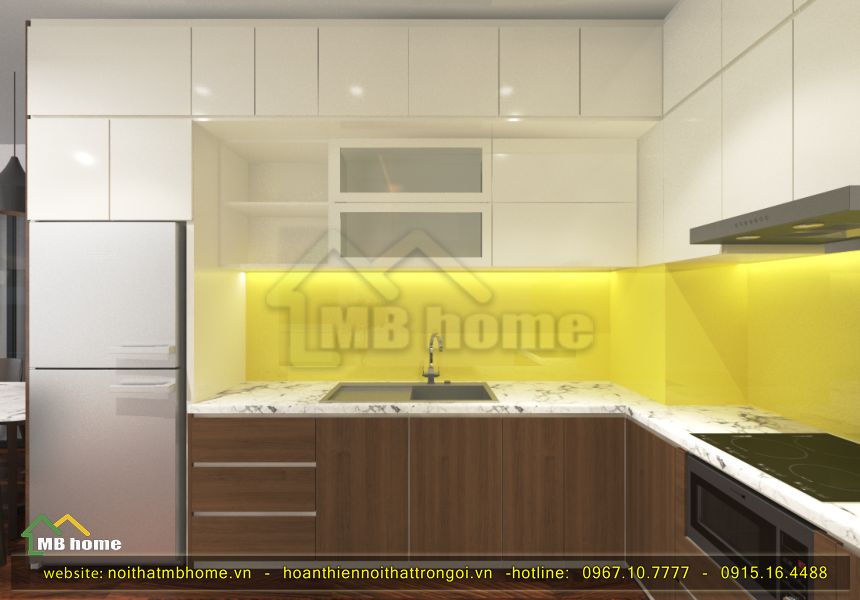 Bàn bếp vẫn được giữ nguyên các tone màu chủ đạo, đồng thời được tạo điểm nhấn bởi lớp kính bóng màu vàng chanh. Ngoài ra, do căn bếp nhỏ hẹp nên đã sắp xếp thành chữ L, chiếc tủ lạnh chìm với phần tủ kệ và được lắp kín nhằm thêm chỗ để đồ mà vẫn tiết kiệm được không gian.