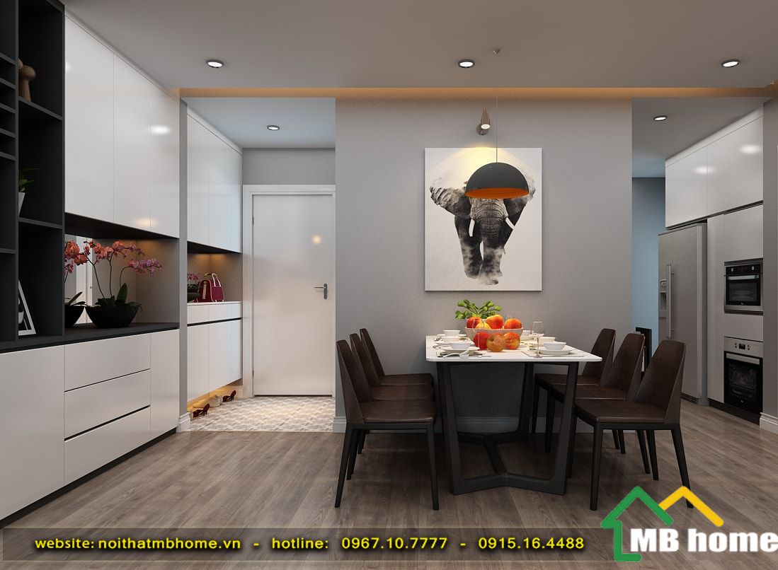 Bàn ăn được đặt ở vị trí gần phòng khách, nơi rộng rãi thoải mái tiện cho sinh hoạt. Thiết kế chiếc bàn dài với 6 chiếc ghế đi kèm. Trang trí vào khoảng trống bên tường bằng 1 bức tranh.