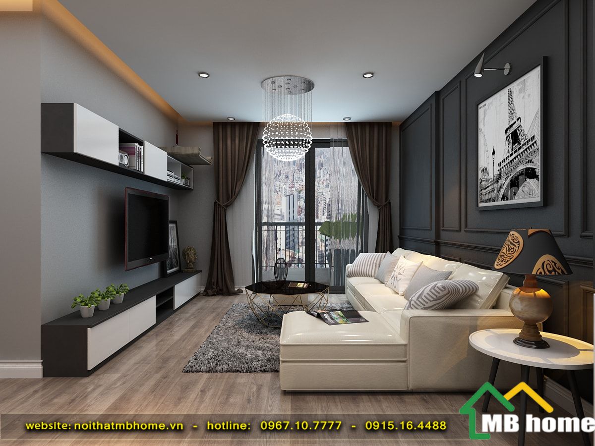 Căn hộ chung cư với thiết kế phòng khách cùng tông màu trầm chủ đạo. Nổi bật trong không gian phòng khách là sự kết hợp hài hòa giữa màu gỗ ốp tường, bộ ghế sofa màu khói nhẹ nhàng hay hệ thống rèm cửa sổ hai lớp tiện dụng.