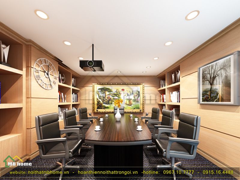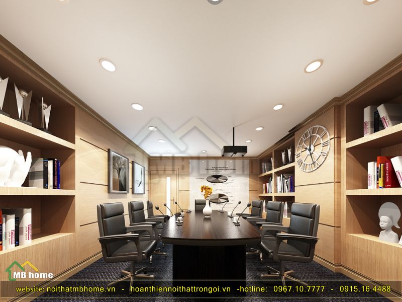 Từ trên nhìn xuống dưới chúng ta sẽ thấy được sự hài hòa và hợp nhất của nội thất phòng họp, từ thiết kế tủ sát âm tường cùng với bàn ghế ngồi họp. Chiếc tủ âm tường là một trong các tủ vô cùng hiện đại và tiết kiệm được rất nhiều không gian đi lại. Bên cạnh đó chiếc bàn ngồi họp có màu gỗ nâu đậm giúp tăng lên sự sang trọng và uy nghiêm và những ghế dựa lưng màu đen âm ái với lớp đệm dày dặn.