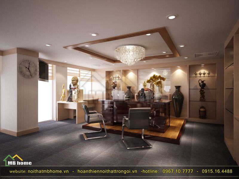 Bàn làm việc của giám đốc được lựa chọn chiếc bàn chắc chắn với lớp gỗ nâu bóng bẩy toát lên được vẻ đang trang trọng và uy nghiêm, cộng với chiếc ghế dựa bản to vô cùng uy lực. Đừng sau lưng đều được sang trí bằng các đồ vật giá trị và mang tính đẹp tân cố điển rất cao. Điểm tạo thêm sự trang trọng đó chính là bởi chiếc đèn trùm to và sáng rủ xuống mặt bàn.
