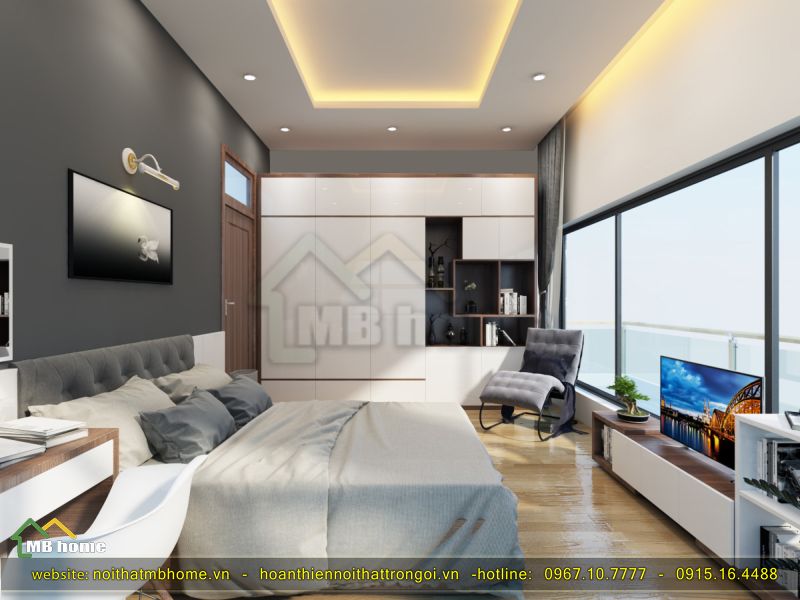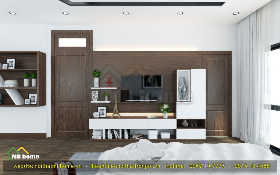 Để tạo nên sự hài hòa và tao nhã trong căn phòng, MB Home đã sử dụng chính các tone màu trắng và xám lạnh vô cùng đặc việt và nổi bật. Chiếc tủ quần áo màu trắng với một góc ô trang trí rất bắt mắt và độc đáo.