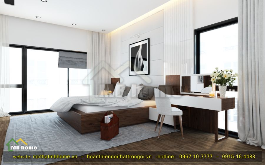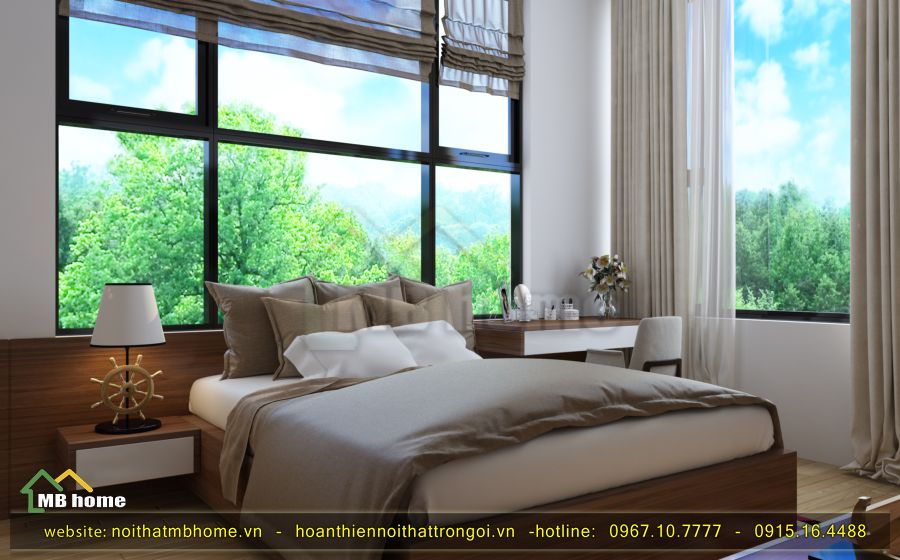 MB Home sử dụng tông màu trầm tự nhiên của gỗ để tạo điểm nhấn cho phòng ngủ này. Kết hợp với không gian thoáng đã nhìn ra phía sân vườn thật sự đẹp và giúp thư giãn, sáng khoái.
