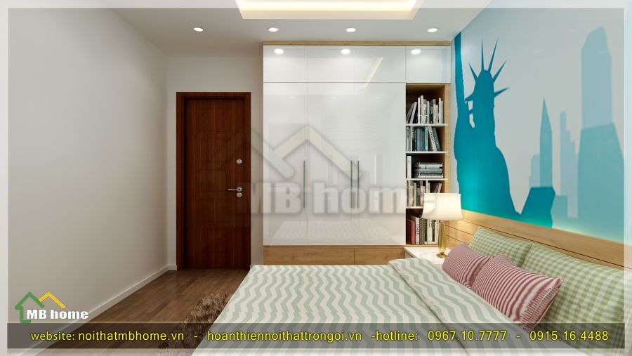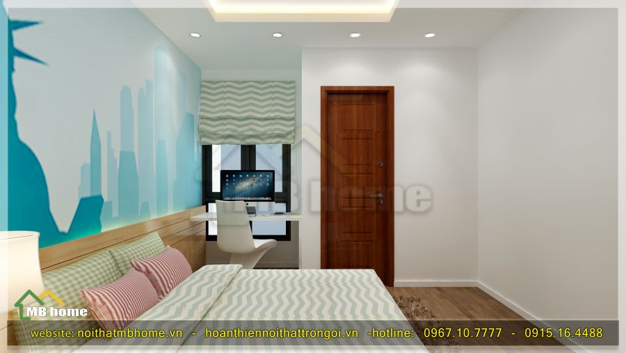 Một căn phòng thì nhã nhặn tinh tế nhưng vẫn cực kì trẻ trung năng động khi sử dụng nội thất với tông màu gỗ sáng và nhã nhặn. Để làm điểm nhấn đặc biệt cho căn phòng, chúng tôi đã thiết kế cho căn phòng những bức tranh được vẽ lên tường vô cùng tỉ mỉ và đẹp mắt.