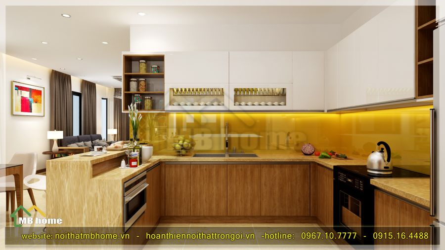 Tại khu vực nấu ăn, chúng tôi muốn giữ được sự ấm cúng cũng như sang trọng mà vẫn đầy đủ tiện nghi, MB Home chúng tôi đã thiết kế cho căn phòng một tủ bếp chữ U bằng gỗ và được phối hai màu quen thuộc là trắng và nâu gỗ.